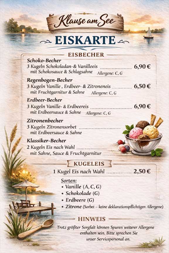 Wir bereiten fast alles frisch aus möglichst regionalen Zutaten zu. Daher kann es passieren, dass es z. B. nicht immer das gleiche Angebot an Fisch, Gemüse oder Obst gibt.